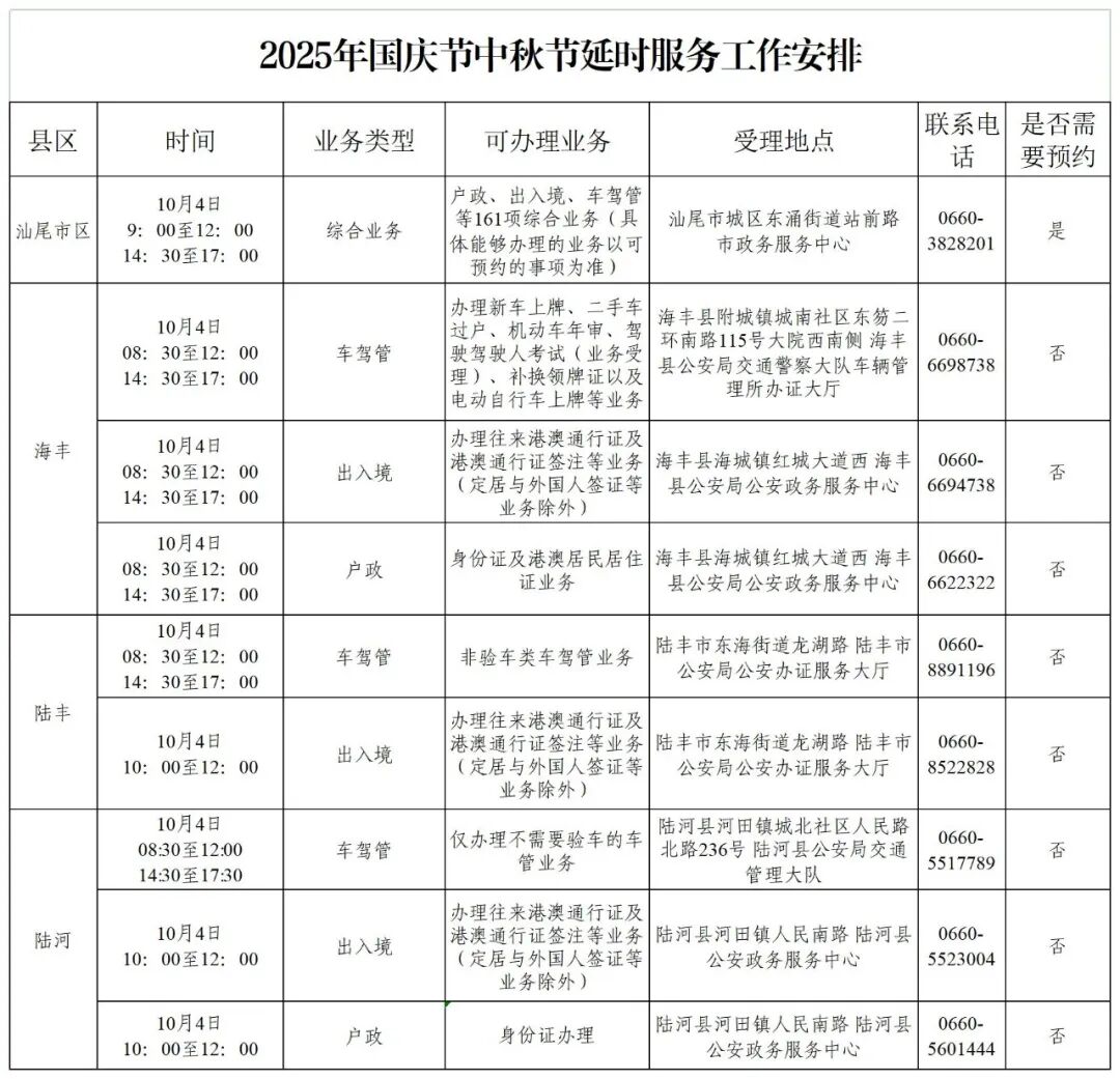 根据《国务院办公厅关于2025年部分节假日安排的通知》精神,2025年10月1日至10月8日为国庆节、中秋节假期。期间,为方便有办理公安政务服务事项需求的市民,汕尾市公安政务服务窗口9月28日(周日补班)、10月4日(周六延时)、10月11日(周六补班)正常对外办公(办公时间为8:30-12:00、14:30-17:30)。其中,10月4日(周六延时)可办理的业务事项及对外服务时间请查看附表。9月27日(周六)、10月1日至3日、10月5日至8日、10月12日(周日)暂停对外办公。