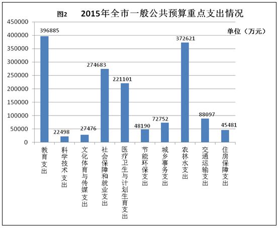 2015年全市一般公共预算支出完成2129982万元,完成调整预算的180.45%,比上年增支881740万元,增长70.64%。