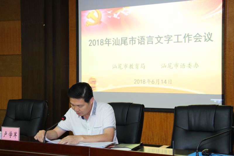 2018年6月14日,市教育局、市语委办组织召开了2018年汕尾市语言文字工作会议,传达学习2018年全省语言文字工作会议精神,部署开展广东省三类城市语言文字工作督导评估暨普通话基本普及县域验收工作,部署开展全市中小学语言文字全面达标建设工作。市教育局党组副书记、副局长卢学军同志出席会议并讲话,市教育局党组成员、调研员刘炎同志主持会议。各县(市、区)教育局分管语言文字工作的领导、分管教育督导工作的领导,语委办主任或语委办专干,市直各中小学分管语言文字工作的领导,市语委部分同志等共36人参加了会议。