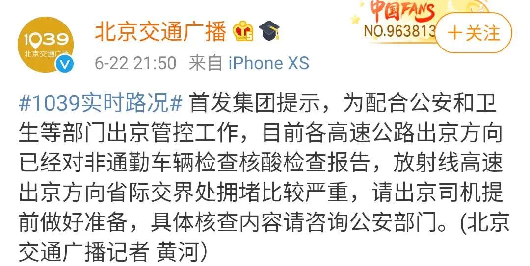 @北京交通广播6月22日消息,首发集团提示,为配合公安和卫生等部门出京管控工作,目前各高速公路出京方向已经对非通勤车辆检查核酸检查报告,放射线高速出京方向省际交界处拥堵比较严重,请出京司机提前做好准备,具体核查内容请咨询公安部门。