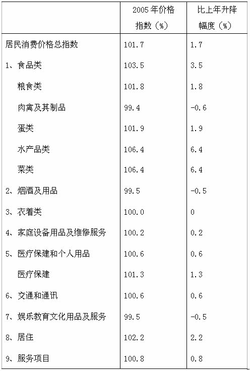 市区消费价格总指数上升1.7%,其中食品上升3.5%,医疗保健上升1.3%,居住上升2.2%,家庭设备用品及维修服务上升0.2%,交通上升3.4%,通讯下降2%。
