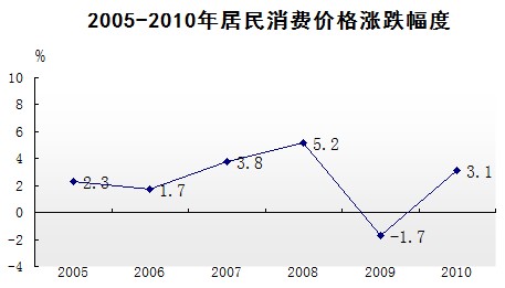 2010年,随着食品价格的上涨及原油、有色金属、棉花、粮食等国际大宗商品价格持续走强,总体物价水平呈逐步攀升的态势。全年累计,居民消费价格总指数上涨3.1%,其中消费品价格指数上涨3.9%。居民消费价格中,食品价格上升6.6%,其中,菜类和水产品价格分别上涨20.4%和7.2%;居住类价格上涨5.8%,其中水、电、燃料价格上涨10.0%。