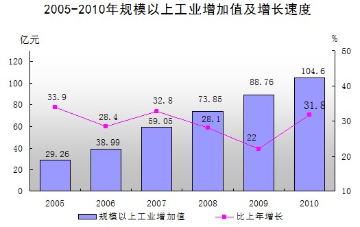 全年完成全社会工业增加值186.56亿元,增长25.3%。规模以上工业增加值104.64亿元,同比增长31.8%,按经济类型分,国有企业增长16.8%,集体企业增长21.3%,股份制企业增长34.6%,外商及港澳台投资企业增长29.3%。实现规模以上工业销售产值310.51亿元,增长27.6%;其中工业产品出口交货值135.39亿元,增长14.3%,占销售产值的43.6%。