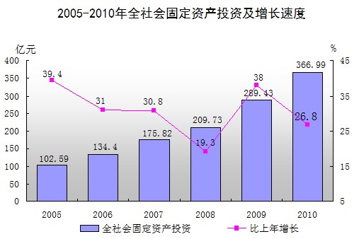 投资规模继续扩大。2010年,全市完成全社会固定资产投资366.99亿元,同比增长26.8%。其中,城镇以上固定资产投资300.33亿元,增长29.4%;农村固定资产投资66.65亿元 ,增长16.4%。