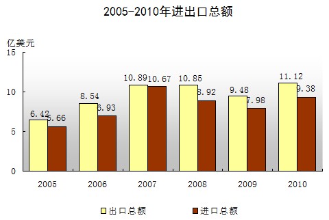 全年累计新签合同协议24宗,合同利用外商直接投资5.27亿美元,增长22.4%,实际吸收外商直接资2.85亿美元,增长3.1%。全年完成外贸进出口总值20.50亿美元,比上年增长17.4%,其中出口总值11.12亿美元,比上年增长17.3%。 从贸易方式看,一般贸易出口1.85亿美元,增长49.9%;加工贸易出口9.26亿美元, 增长12.2%。从经营主体看,“三资”企业占主导地位,累计出口8.98亿美元,增长19.8%,占80.8%。