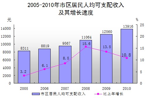市区居民人均可支配收入13916元,增长10.8%,人均消费支出10013元,增长14.6%,市区居民家庭恩格尔系数为44.1%,比上年下降0.2个百分点。据劳动工资统计,全市在岗职工工资总额38.15亿元,比上年增长19.8%,在岗职工人均工资25501元,增长9.7%。