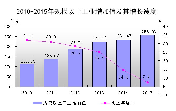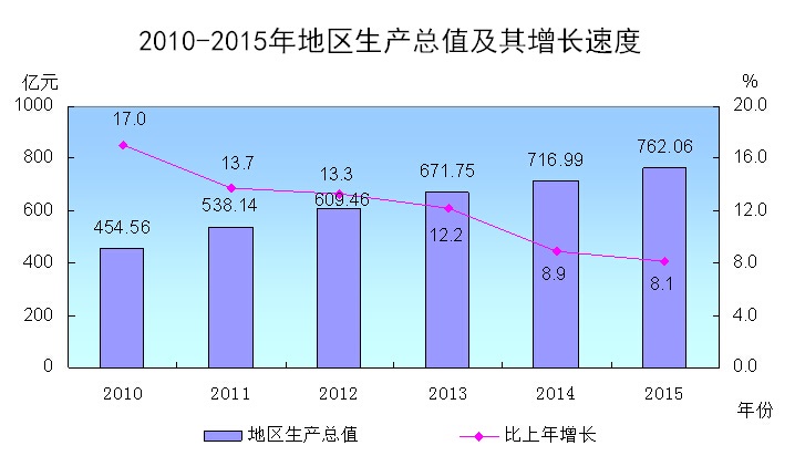初步核实,2015年全市实现地区生产总值(GDP)762.06亿元,比上年增长8.1%。其中,第一产业增加值118.04亿元,增长4.4%,对GDP增长的贡献率为6.8%;第二产业增加值348.70亿元,增长7.2%,对GDP增长的贡献率为47.1%;第三产业增加值295.32亿元,增长10.8%,对GDP增长的贡献率为46.1%。三次产业结构为15.5:45.8:38.7。全市人均地区生产总值达到25283元(按年平均汇率折合4059美元),增长7.4%。