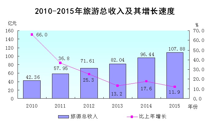 全年接待过夜游客728.58万人次,增长12.7%。其中,入境游客4.62万人次,增长35.2%;国内游客723.96万人次,增长12.6%。在入境游客中,接待港澳台同胞4.61万人次,增长35.2%;外国人95人次,增长31.9%。全市旅游总收入107.88亿元,增长11.9%。其中,国内收入106.32亿元,增长11.5%。国际旅游外汇收入2537.74万美元,增长43.6%。