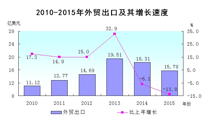 全年完成进出口总额32.02亿美元,比上年下降18.9%。其中,出口总额15.78亿美元,下降13.8%;进口总额16.24亿美元,下降23.2%。