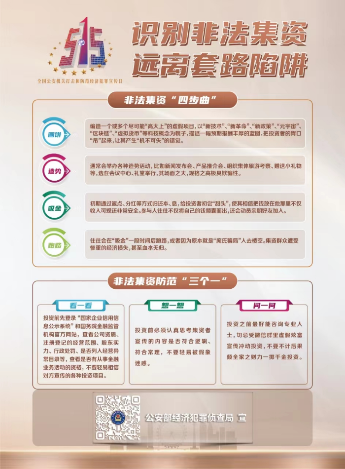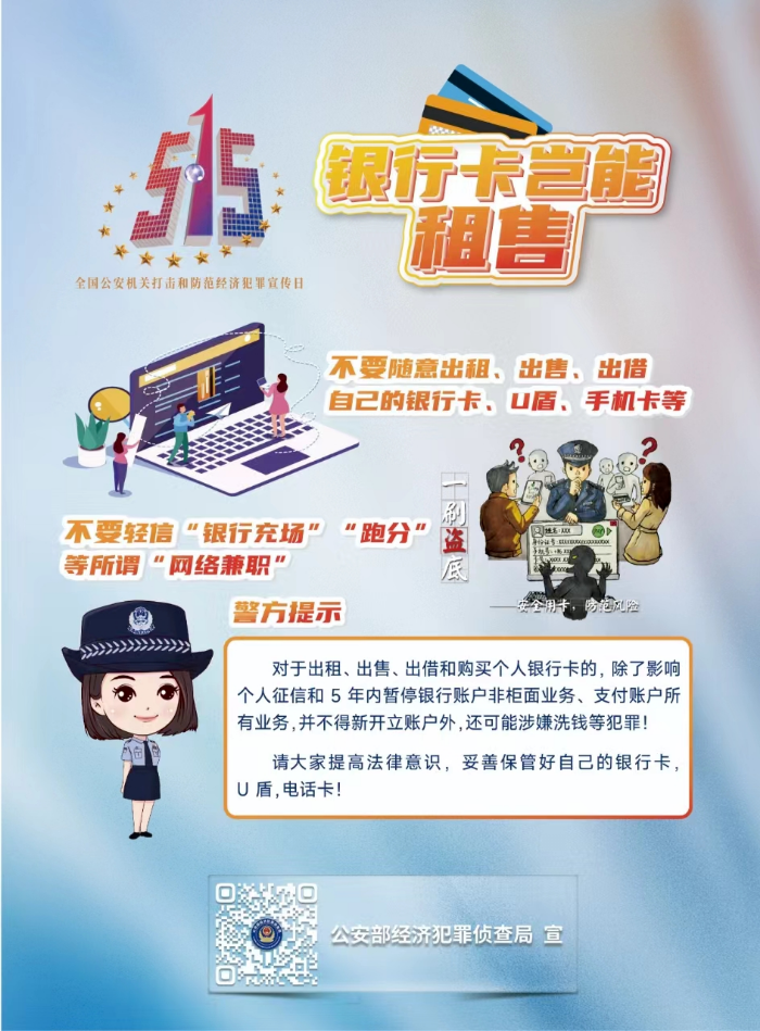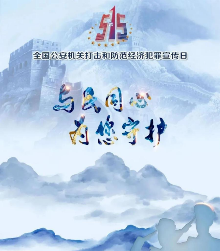 今天5月15日是第十五个全国公安机关打击和防范经济犯罪宣传日主题是“与民同心,为您守护”