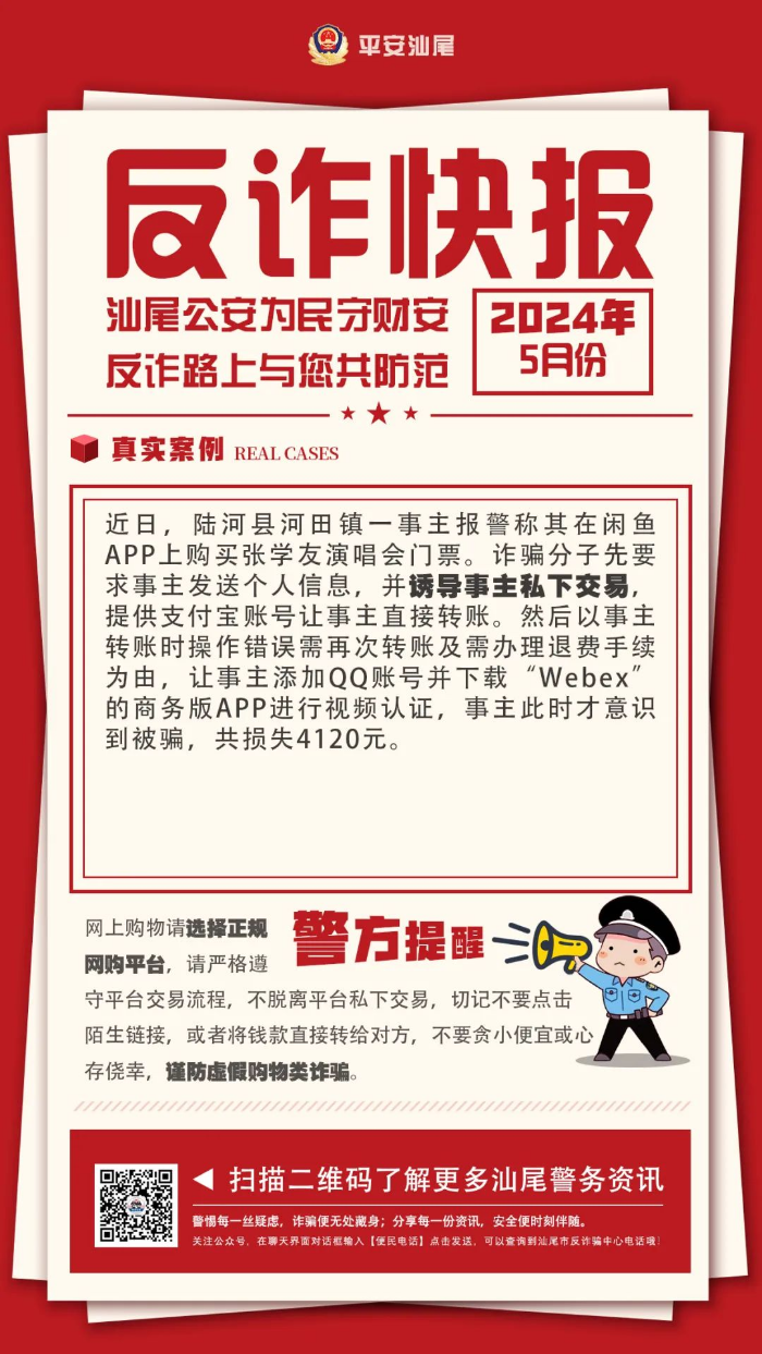 真实案例:近日,陆河县河田镇一事主报警称其在闲鱼APP上购买张学友演唱会门票。诈骗分子先要求事主发送个人信息,并诱导事主私下交易,提供支付宝账号让事主直接转账。然后以事主转账时操作错误需再次转账及需办理退费手续为由,让事主添加QQ账号并下载“Webex”的商务版APP进行视频认证,事主此时才意识到被骗,共损失4120元。