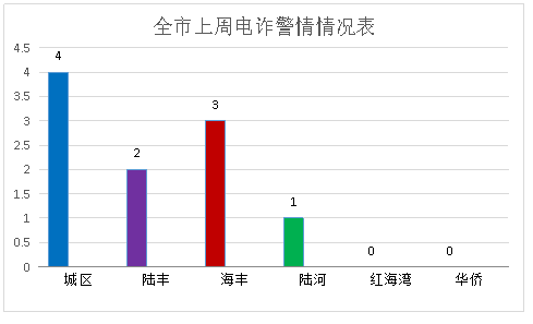 上周电诈警情中,城区警情发生在香洲街道、凤山街道和东涌镇;海丰警情发生在城东镇;陆丰警情发生在陂洋镇和城东镇;陆河警情发生在河口镇。电诈警情发生较多的镇街是海丰县城东镇和城区东涌镇,分别为3起和2起