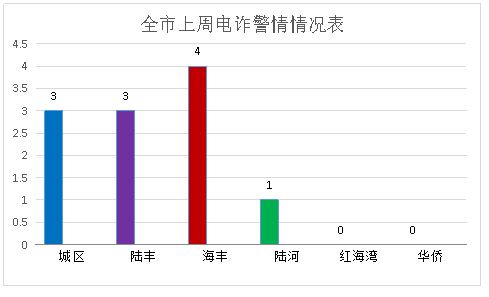 上周电诈警情中,城区警情发生在凤山街道和东涌镇;海丰警情发生在城东镇和海城镇;陆丰警情发生在东海街道、河西街道和南塘镇;陆河警情发生在河田街道;电诈警情发生较多的镇街是海丰城东镇和城区东涌镇,分别为3起和2起。
