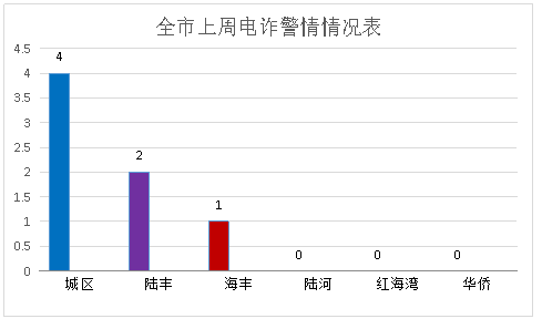 上周电诈警情中,城区警情发生在风山街道和红草镇;海丰警情发生在梅陇镇;陆丰警情发生在东海街道和城东街道;电诈警情发生较多的镇街是凤山街道,为3起。