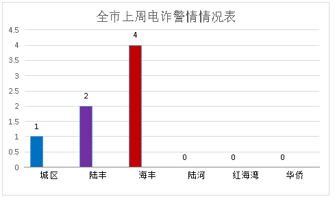上周电诈警情中,城区警情发生在东涌镇;海丰警情发生在城东镇和附城镇;陆丰警情发生在东海街道和碣石镇。电诈警情发生较多的镇街是海丰城东镇,为3起。