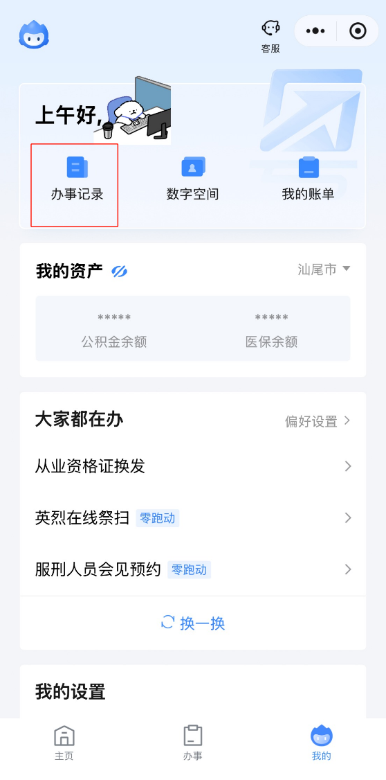 再次进入 “粤省事”微信小程序,点击【我的】-【办事记录】就可以查询啦!