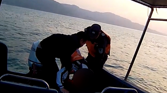 接警后,水上派出所立即启动应急救援机制,第一时间联动渔政部门,迅速开展搜救工作,通过渔船定位器成功锁定人员大概的落水海域。但是海域广袤无垠,在茫茫大海上进行全面地毯式搜寻需要很多时间,民警黄晓斌立马转变搜寻方式,在到达落水海域后跟收到求救信号的渔船取得联系,分析研判行船路线,避开重复搜寻区域进行系统性搜救,最终在汕尾港对开海域发现一个漂浮在海面上的白点。警员们当机立断以最快速度向着漂浮物方向驶去,发现两名落海渔民正紧紧抓住渔船仅剩的冰箱浮在海上。此时,天已蒙蒙亮,距离接到报警还不到一小时。民警以最快速度用救生工具将落水人员救援上船后,立即脱下身上的警服给两人保暖并递上矿泉水补充水分。落海人员此时虽意识清醒,但体力已严重透支,且存在失温的情况,身体状况虚弱。在返港途中,民警联系报警人林女士跟其报平安,同步联系了120在岸边待命,以便第一时间将落水人员送去医院做进一步检查。靠岸后,民警为落水人员换掉湿透的衣物,并提供热水暖身子,随后便将其送上120救护车。