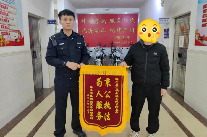 3月5日,体彩店的李先生带着一面印有“人民警察热心为民,破案神速为民解忧”的锦旗来到东涌派出所,将锦旗送到民警手中。