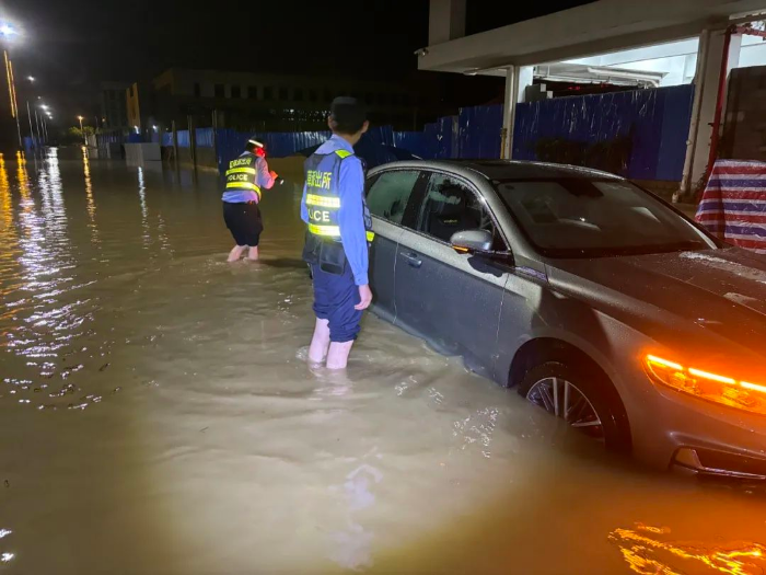 2024年4月27日21时许,红草派出所民警辅警在汕尾市城区红草镇南堤西路帮助辖区受灾群众转移车辆。