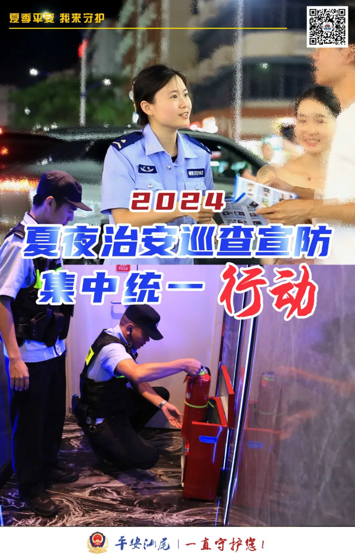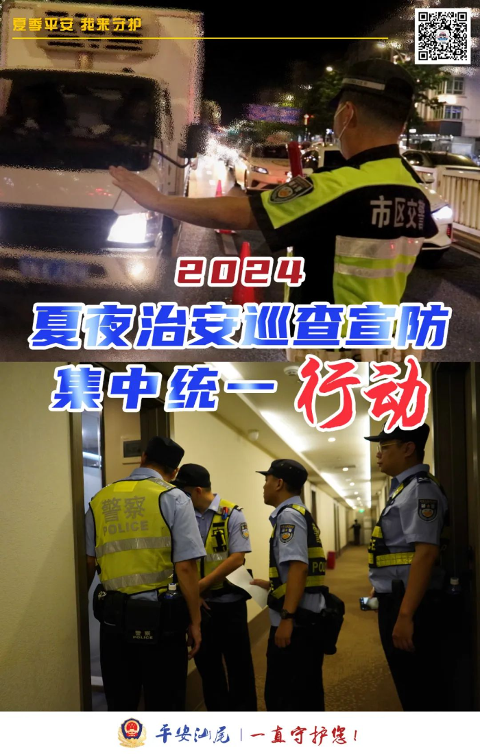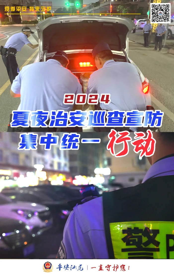 根据全国公安机关夏夜治安巡查宣防集中统一行动安排,汕尾公安于7月6日启动全市夏夜治安巡查宣防第一次集中统一行动。针对夏季社会治安规律和夜间警情案件特点,全市公安机关深入落实“立体巡、精准查、集中宣、主动防”的工作要求,在重点部位、重点场所、重点路段,集中力量组织开展夏夜治安巡查宣防集中统一行动,让“夏季平安灯”更亮、“人间烟火气”更浓、“社会安全阀”更紧。行动期间,全市累计出动警力5207人次,发动投入群防群治力量4432人次,抓获在逃人员9人、现行违法犯罪嫌疑人121人。