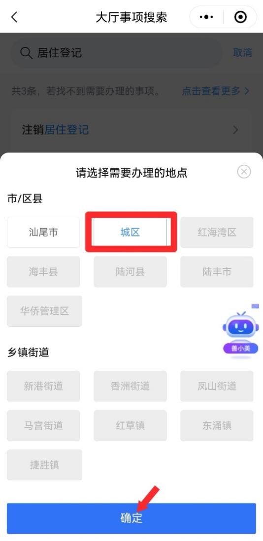 第二步:在搜索框中,输入需要办理的业务事项,根据搜索结果选择办理事项对应的链接,选择办理地点【城区】(注:目前仅支持办理汕尾市城区的居住证业务),并点击【确定】进入业务办理页面。