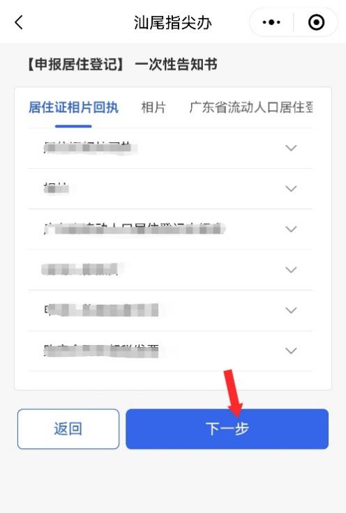 第六步:进入“一次性告知书”页面,根据“一次性告知书”内容,准备好对应的办理材料,点击【下一步】。