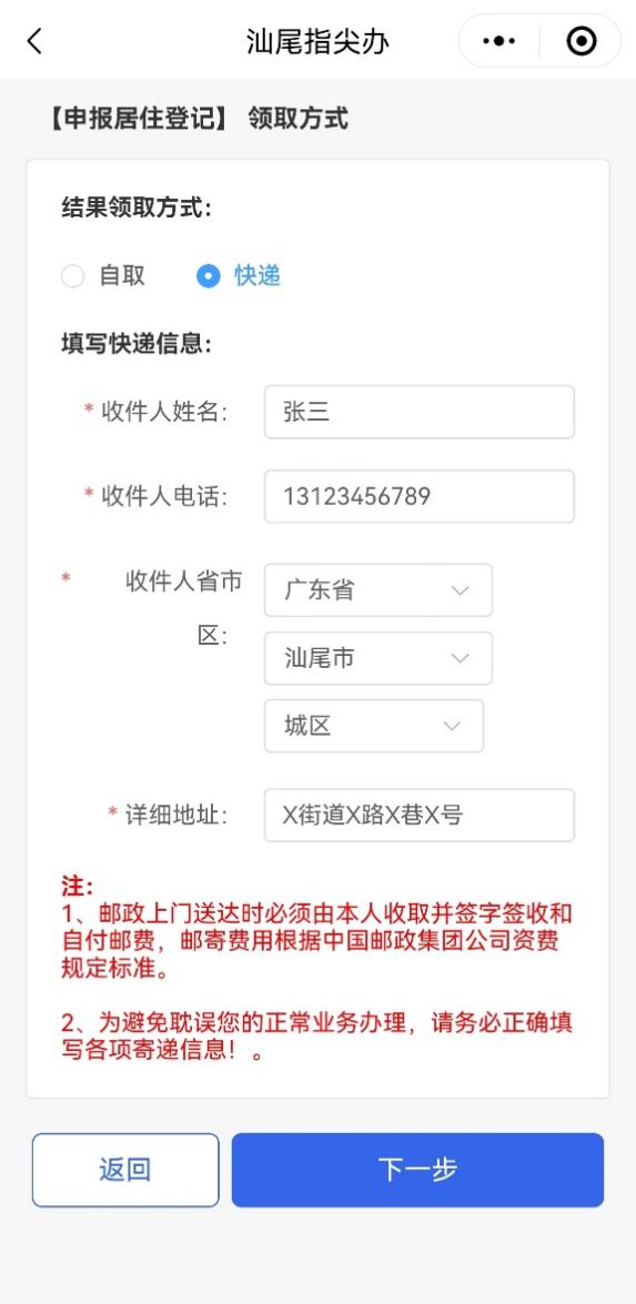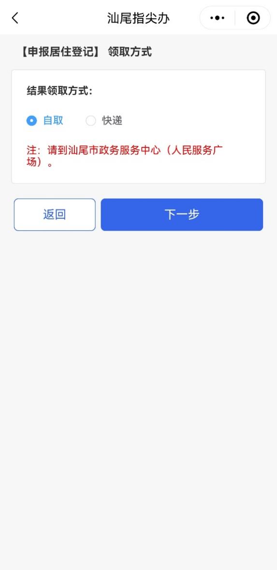 第七步:进入证件“领取方式”页面,可选择自取或快递任一领取方式。选择自取需待业务办结后自行到汕尾市政务服务中心公安业务区领取;选择快递则需填写收件人信息、收件电话、收件地址等快递信息,待证件办结后将由邮政快递上门送达,邮寄费到付。选择领取方式后,继续点击【下一步】。