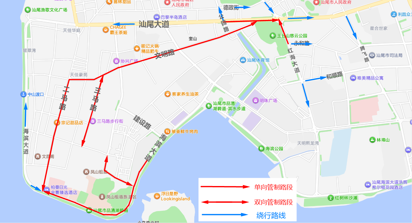 (一)需途经管制路段的车辆请提前绕行,由南向北方向途经汕尾大道的可绕行公园路至红海大道或由工业大道绕行,由北向南方向途经汕尾大道需往汕尾大道以东区域的可绕行至工业大道、腾飞路,由东向西方向途经海滨大道的可提前由腾飞路沿汕尾大道方向绕行,同时注意安全、减速慢行、服从执勤民辅警的指挥。