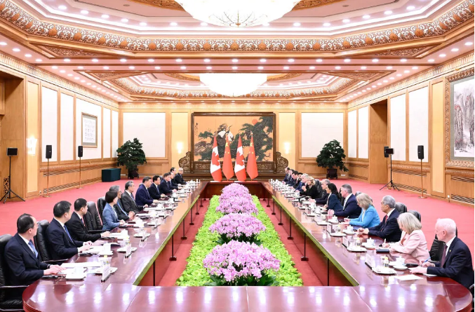 习近平指出,去年10月,我们在韩国庆州会见,开启了中加关系转圜向好的新局面。双方就恢复和重启各领域合作深入探讨,取得积极成果。中加关系健康稳定发展符合两国共同利益,也有利于世界和平稳定和发展繁荣。双方要本着对历史、对人民、对世界负责任的态度,推进构建中加新型战略伙伴关系,推动中加关系迈入健康、稳定、可持续的发展轨道,更好造福两国人民。