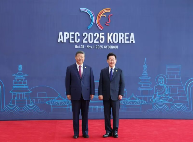 习近平抵达会场时,韩国总统李在明热情迎接。
