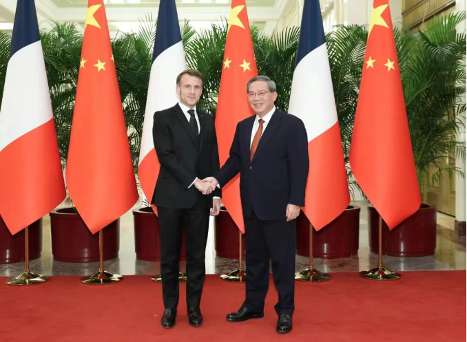 李强表示,近年来,在两国元首战略引领下,中法关系与合作取得很多新的进展和成果。今天上午,习近平主席同总统先生举行会晤,为进一步深化两国关系指明了方向。中法同为全球主要经济体和联合国安理会常任理事国,保持密切战略沟通,开展协调有力行动,不仅有利于双方携手发展,也能为当今变乱交织的世界注入更多稳定性、确定性。中方愿同法方一道继续努力,赓续传统友谊,巩固政治互信,加强全方位合作,推动中法全面战略伙伴关系迈上新台阶。