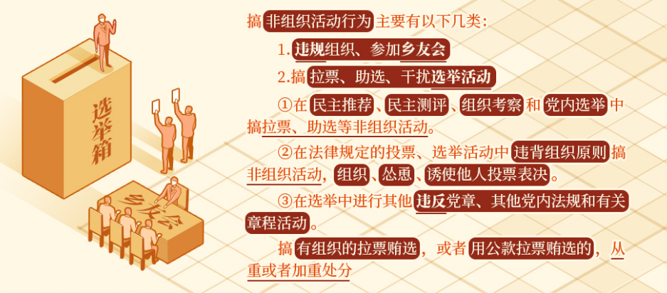 党内选举是党内政治生活的重要组成部分。《关于新形势下党内政治生活的若干准则》规定,党内选举必须体现选举人意志,坚决防止和查处拉票贿选等行为。在选举活动中搞非组织活动,干扰选举人表达选举意愿,侵犯其他被选举人权益,侵蚀党内政治文化,在党员群众中造成不良影响,对这类违反组织纪律的行为必须予以坚决惩治。