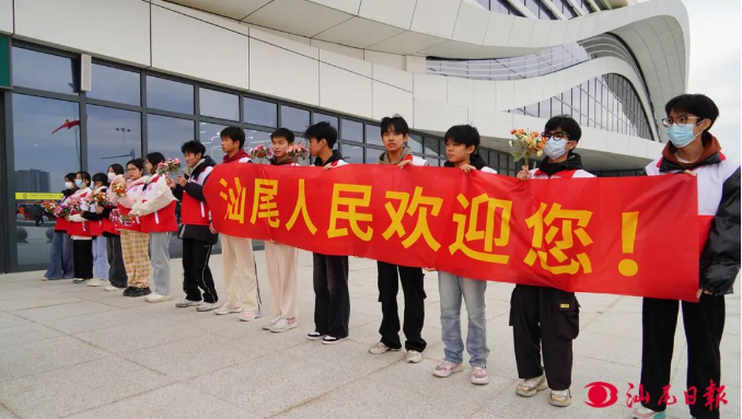 为上午9时28分从汕头南站乘坐首发高铁列车来到汕尾站的旅游体验团而准备的欢迎仪式,由100人组成的游客团作为汕汕高铁正式通行首日的首发列车体验团,在电影天堂