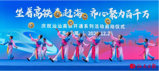 在汕汕高铁汕尾至汕头南段开通运营首日启动主题为“坐着高铁来赶海 齐心聚力百千万”庆祝汕汕高铁开通系列活动,持续掀起宣传汕尾、推介汕尾热潮,充分展示汕尾“山海湖城、红色圣地、活力湾区”良好城市形象,推介汕尾丰富的自然资源、人文资源和良好的投资营商环境。 12月26日上午,新建陆丰南站、陆丰东站正式启用,站前广场热闹非凡,热情欢快的醒狮表演、婉转灵动的钱鼓舞、热血沸腾的《奔向海陆丰》歌曲演唱、风味上乘的陆丰特色美食、包装精美的农特产品展销、“花式多样”的文旅宣传招商推介……一系列节目和文旅活动精彩上阵,吸引了不少市民群众到此打卡留念,充分满足广大群众的“胃口”。 国家级非遗甲子英歌舞引“燃”启动仪式,为汕汕高铁汕尾至汕头南段开通喝彩。 记者 陈茂辛 摄 “汕汕高铁既是汕尾与外界政策沟通、贸易畅通、资金融通、民心相通的重要基础设施,也是汕尾实现开放合作、互利共赢、文化融合的重要纽带。”仪式上,电影天堂