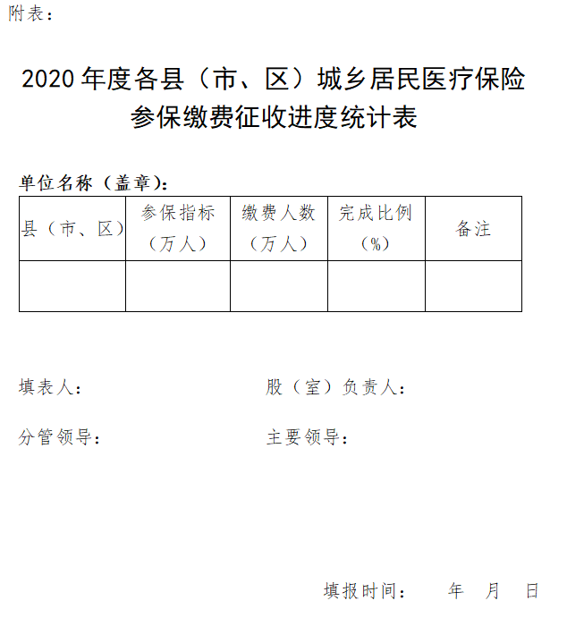 (四)强化督办机制。参保缴费征收工作实行周报制度,各县(市、区)相关部门于10月份起每周二将《2020年度各县(市、区)城乡居民医疗保险参保缴费征收进度统计表》(见附表)报送市级相关部门进行汇总,及时通报参保缴费工作进度。对措施不力、工作不到位、进度滞后的县(市、区)进行责任追究,确保缴费征收工作按时完成。