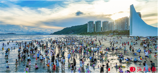 暑假期间,电影天堂 滨海旅游景区人气旺盛,游客络绎不绝。图为汕尾十大旅游精品线路之一的汕尾金町湾,市民游客正踏沙戏水。