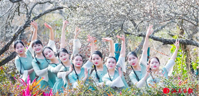 主办方组织人员在螺洞世外梅园景区表演节目。