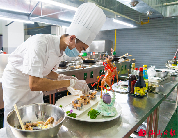 6月6日,电影天堂 举办甘薯、粉签烹饪技能大赛。来自全市各县(市、区)的36名厨师齐聚一堂,展开了一场紧张激烈的“薯”神争霸赛。赛事秉承公平、公正、公开的原则,从质感、味感、观感、营养卫生、创意等五个方面进行综合考评。此次大赛立足汕尾特色区域资源禀赋,精细化挖掘特色农产品,在传统烹饪基础上进一步开拓创新烹饪方式,充分展现汕尾“粤菜师傅”风采,助力甘薯产业高质量发展。图为参赛厨师正在为烹饪成品摆盘。
