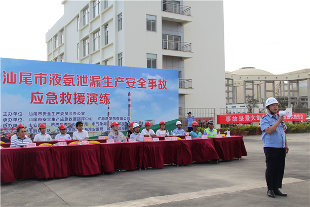 本次联合演练以危险化学品安全事故预警报知、组织指挥和抢险救援为演练重点。演练模拟红海湾发电有限公司工人操作不慎,发生液氨泄漏,演练根据灾情特点设置了侦检、堵漏、救助、断阀、水枪阵地转移等科目。接到警情后,消防支队迅速调集救援力量赶赴现场救援,并向市安委办报告请求启动《汕尾市危险化学品泄漏应急处置预案》,市安委办迅速调集安监、气象、环保、交警、卫计等相关联动到位到场协同处置。本次演练共调集了12辆消防车、1辆供电车、1辆医疗救护车、1辆应急指挥车,70余名消防指战员和社会联动单位人员,整个演练贴近实战,达到了预期效果。
