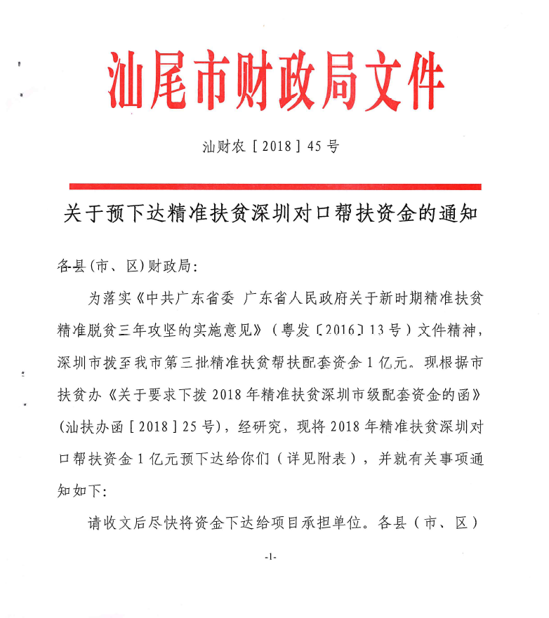 汕财农【2018】45号关于预下达精准扶贫深圳对口帮扶资金的通知