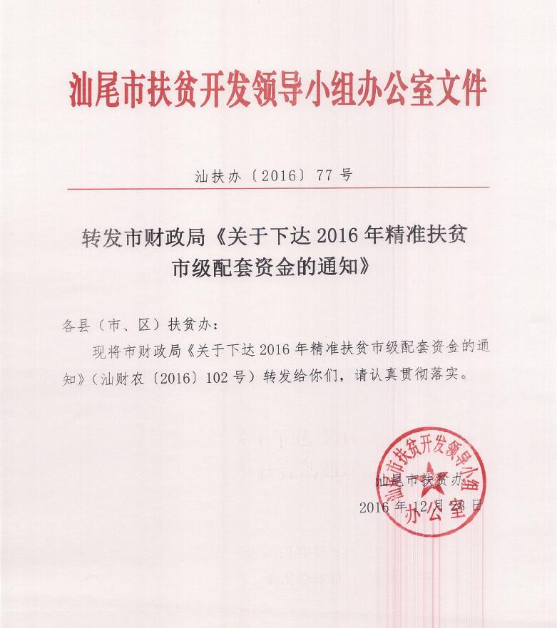 汕扶办[2016]77号(转发市财政局《关于下达2016年精准扶贫市级配套资金的通知》)