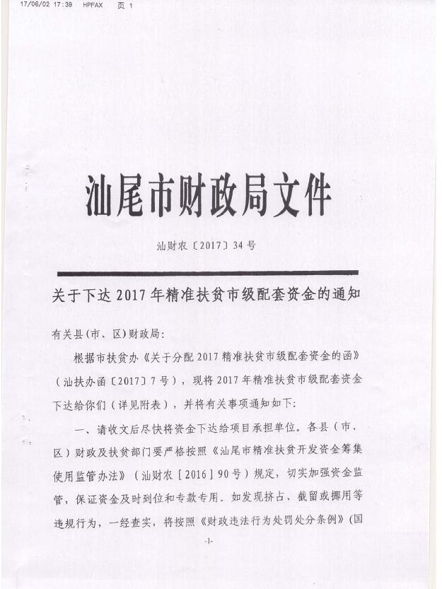 (关于下达2017年精准扶贫市级配套资金的通知)汕财农[2017]34号