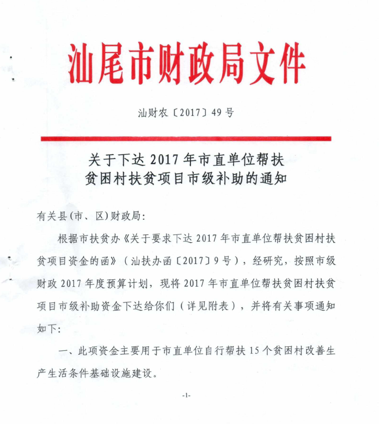 关于下达2017年市直单位帮扶贫困村扶贫项目市级补助的通知