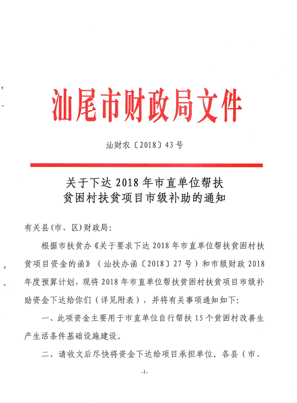 汕财农【2018】43号关于下达2018年市直单位帮扶贫困村扶贫项目市级补助的通知