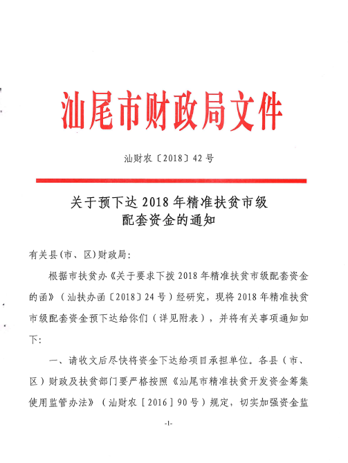 汕财农【2018】42号+关于预下达2018年精准扶贫市级配套资金的通知