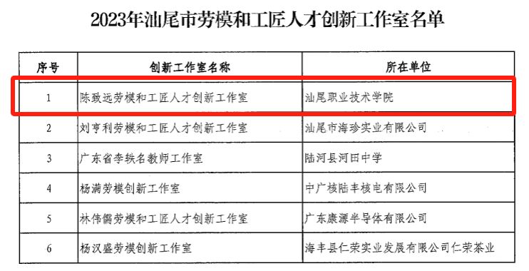 近期,汕尾市总工会正式发文,我校陈致远劳模和工匠人才创新工作室获评为汕尾市劳模和工匠人才创新工作室。这是我校第二个市级劳模与工匠人才创新工作室。