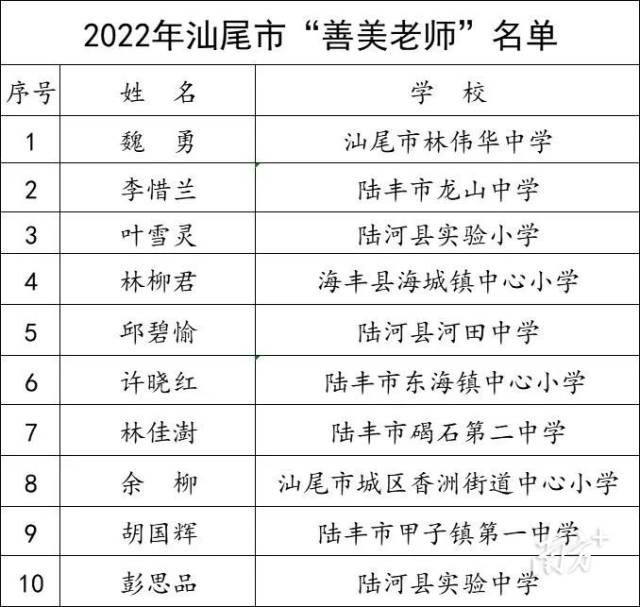 早在今年5月,汕尾市“善美老师”评选活动便已启动。经各级教育行政部门、各级各类学校逐级推荐考察,推选出在教书育人方面作出突出贡献、政治立场坚定、教学水平高、育人能力强的“师德表率、育人模范”共20位。通过前期网络投票、现场演讲、评委评审等程序,评选出10位老师为2022年汕尾市“善美老师”。