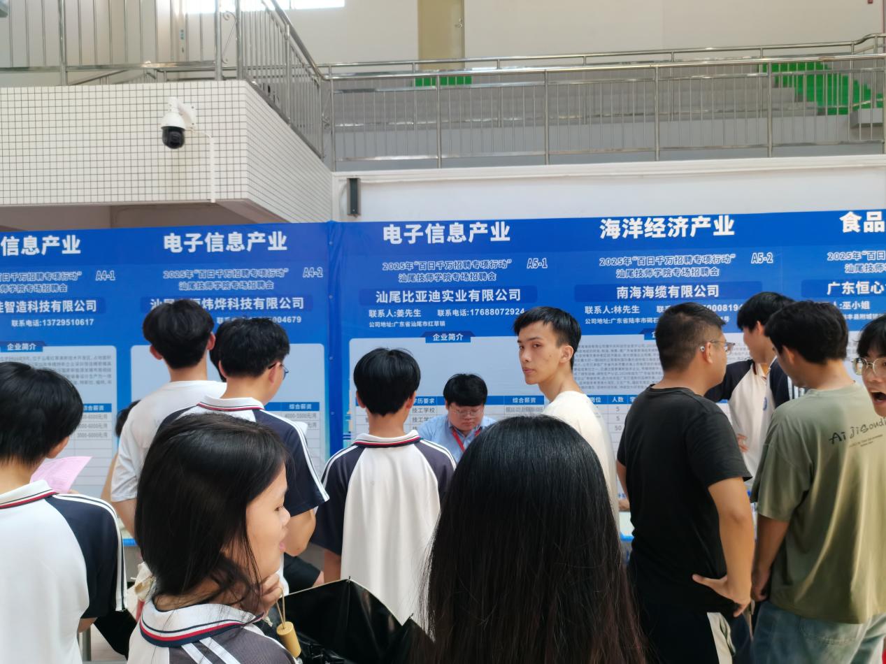 校园招聘会累计126家企业参与,包括信利半导体、汕尾比亚迪、南海海缆等重点优质企业,涵盖电子信息、智能制造、教育服务等领域,提供近4000个岗位。现场分设电子信息、酒店服务、教育等行业招聘专区,匹配区域产业集群与人才需求,促进产才融合。