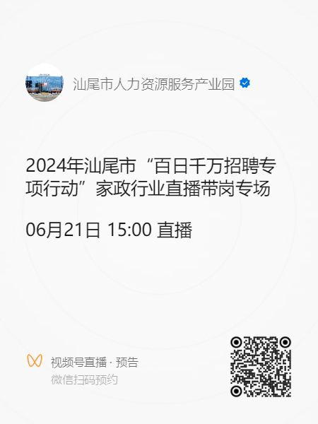 为满足劳动者求职和各类企业招聘的需要,广泛搭建人力资源供求对接平台,让企业招到满意的员工,让求职者找到心仪的岗位,助力广大企业吸引人才,助力广大劳动者高质量充分就业,市人力资源和社会保障局、市总工会定于2024年6月21日15:00联合举办直播带岗专场活动,欢迎广大求职朋友踊跃参与···请用微信扫码预约视频号直播。
