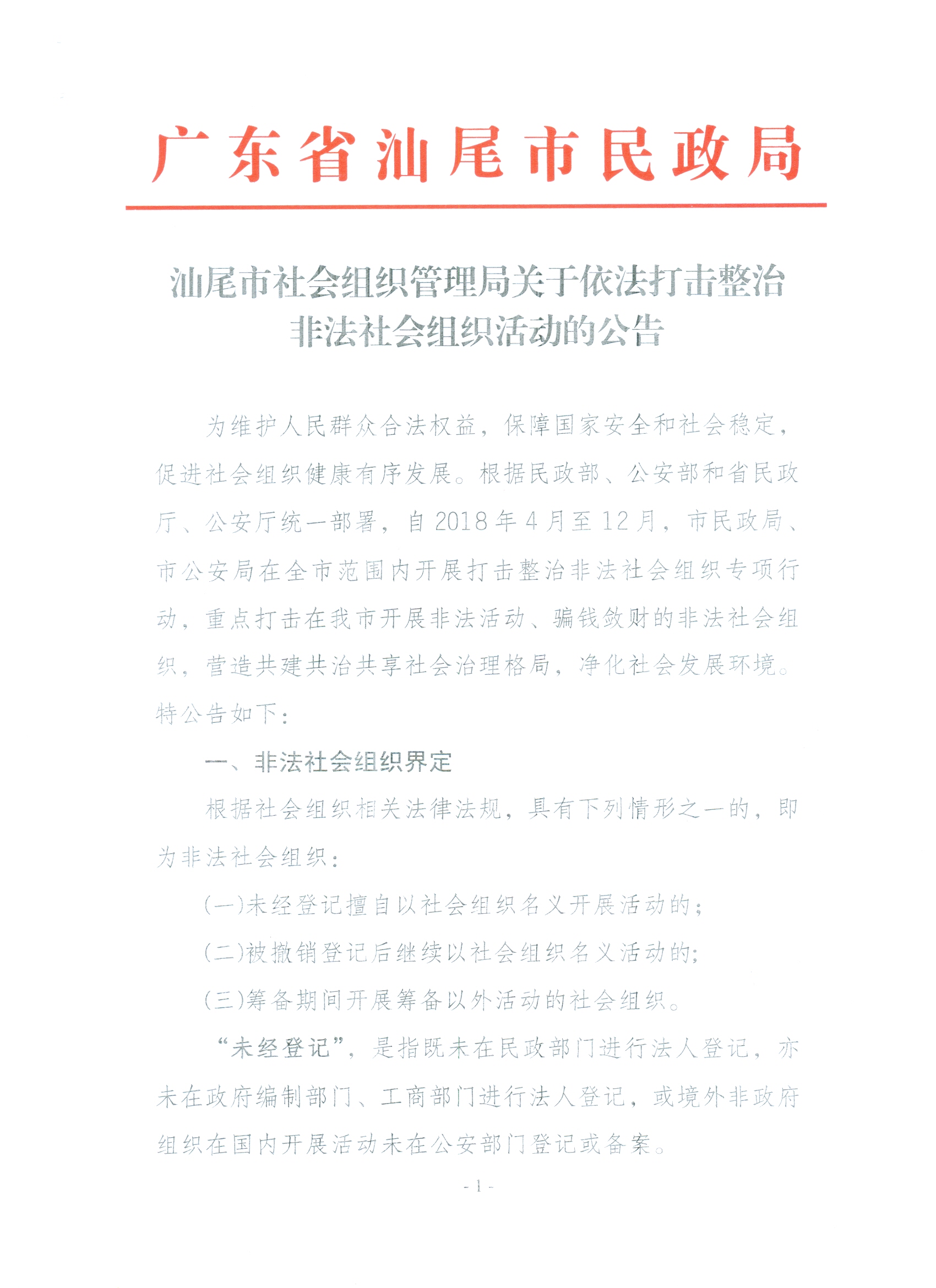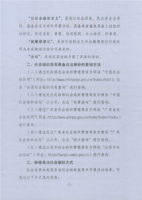 汕尾市社会组织管理局关于依法打击整治非法社会组织活动的公告